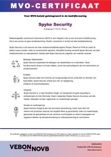 Duurzaam ondernemen moet niet alleen een reclameterm zijn maar daadwerkelijk ingevoerd in een bedrijf. Spyke Security ontving recent het MVO-Certificaat van de brancheorganisatie VEBON-NOVB.